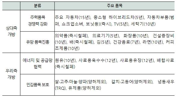 최대 40%의 고율 관세가 적용 중인 한국산 자동차의 경우 발효 후 15년 내 관세를 철폐함으로써 중국, 일본 등 경쟁국 대비 현지 시장 경쟁 여건을 개선했고, 현지 인지도 및 수요가 증가하고 있는 건설중장비, 배, 김, 라면과 같은 K-음식(푸드) 등 중남미지역 주요 유망품목도 관세를 철폐하거나 낮춰 시장 접근성 강화 및 중남미지역 수출 동력화의 길을 열었다.