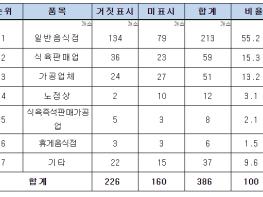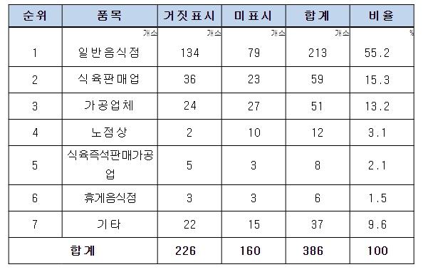 이번 일제점검 결과 위반품목은 돼지고기(110건), 배추김치(95), 두부류(56), 쇠고기(48), 닭고기(18), 쌀(11) 순으로 위반건수가 많았으며, 위반업종은 일반음식점(213개소), 식육판매업체(59), 가공업체(51), 노점상(12), 식육즉석판매가공업체(8) 순으로 나타났다.