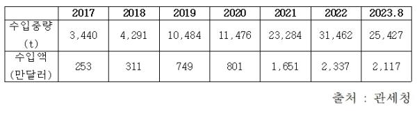 국회 농림축산식품해양수산위원회 소속 최춘식 의원이 관세청에서 제출받은 자료에 따르면, 최근 6년간(2017년~2022년) 외국산 우유 수입량은 매년 큰 폭으로 증가했다. 최근 6년간 우유 수입량과 수입액을 보면, △2017년 3,440t(253만달러), △2018년 4,291t(311만달러), △2019년 10,484t(749만달러), △2020년 11,476t(801만달러), △2021년 23,284t(1,651만달러), △2022년 31,462t(2,337만달러)으로 나타났다. 올해는 8월까지 25,427t(2,117만달러)을 수입했다.