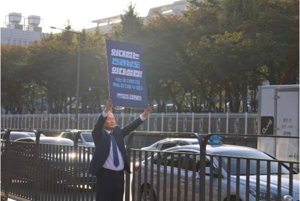 [중앙방송, 박노일기자] 더불어민주당 김원이 의원(목포시, 보건복지위)이 16일(월) 오전, 서울 용산 대통령실 앞에서 전남권 의대신설, 목포의대 유치를 촉구하는 1인 호소를 했다.