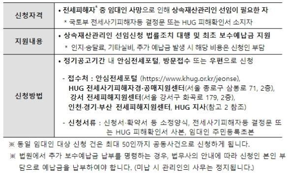상속재산관리인 선임 지원사업의 경우 동일한 사망 임대인에 대하여 피해자가 여러 명인 경우가 많으므로 선임 시 발생되는 관리인 보수 등 신청인 부담을 줄이기 위해 정기공고 방식으로 진행한다.