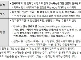 한편, 지원을 희망하는 피해자는 안심전세포털, 경?공매지원센터, 전세피해지원센터, HUG 영업점을 통해 상세한 상담 및 신청 안내를 받을 수 있다.