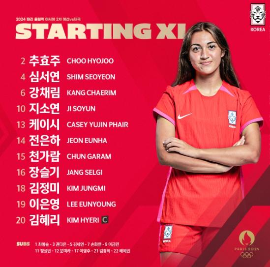 최전방에는 케이시 유진 페어가 배치돼 상대 골문을 노리며, 전은하(수원FC)가 그 밑에서 자유롭게 움직인다.