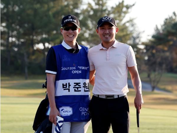 [중앙방송, 김지효기자] 2일부터 경북 구미 소재 골프존카운티 선산 아웃, 인코스(파72. 7,183야드)에서 진행되고 있는 ‘골프존-도레이 오픈(총상금 7억 원, 우승상금 1.4억 원)’에서 ‘괴물’ 김경태(37.신한금융그룹)가 박준원(37)의 캐디로 나서고 있다.