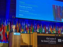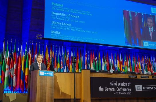 [중앙방송, 김정아기자] 박진 장관은 11월10일과 11일 프랑스 파리 방문 계기 제42차 유네스코(국제연합교육과학문화기구) 총회에 우리나라 수석대표로 참석하여 11월10일 기조연설을 하고, 오드레 아줄레(Audrey Azoulay) 유네스코 사무총장과 11월 11일 면담했다.