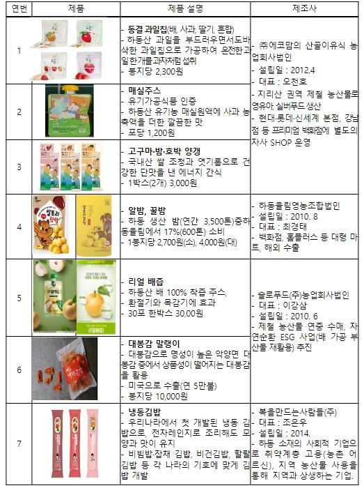 이날 정황근 장관이 추천하는 식품은 농식품부 농촌융복합산업 사업자 인증*을 받은 경남 하동군벤처농업협회 회원사 제품들이다.