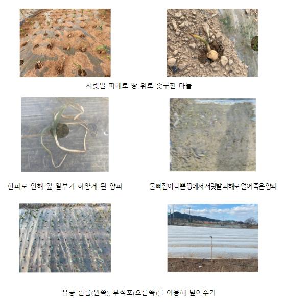 마늘, 양파는 다른 작목보다 추위에 잘 견디지만, 영하 8도 정도에 이틀간 노출되면 언 피해를 볼 수 있다. 일부 지역의 경우, 지역에 맞지 않는 품종을 심기도 하고, 이상 기상과 돌발 한파도 자주 발생하는 추세여서 더 주의를 기울여야 한다.