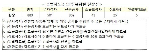 [중앙방송, 박정원기자] 국토교통부는 12월 1일부터 불법하도급 합동단속체계를 가동하고, 불법하도급 의심현장 883개를 해당 지자체에 통보하여 현장 단속을 실시하고 있다고 밝혔다.