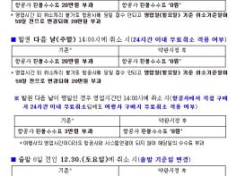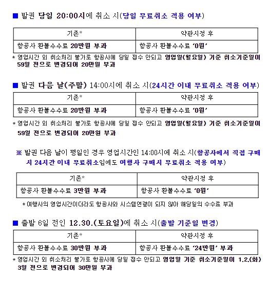 이에 따라 여행사를 통해 취소하는 경우에도 발권 당일은 모든 항공사의 항공권이, 24시간 이내까지는 총 22개 항공사의 항공권이 무료로 취소되도록 다음과 같이 약관이 시정됐다.[8개 여행사 모두 해당]