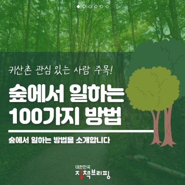 현대 사회에서 자연과의 조화를 추구하는 트렌드가 높아지면서 숲에서의 생활이 주목을 받고 있어요. 최근 들어 장년층을 중심으로 한 귀산촌 인구 증가와 더불어 숲에서의 일자리에 대한 관심 역시 증가하고 있죠.?숲에서 가질 수 있는 직업 정보를 몇가지 알아보고?귀산촌에 관심 있는 분들을 위한 ‘산림일자리 안내서’를 소개합니다.