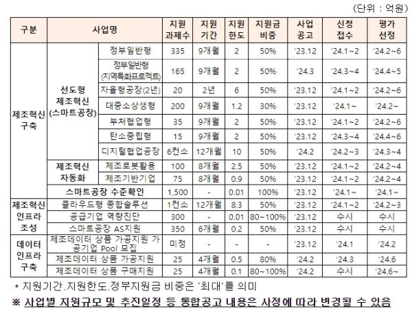 금번 통합공고는 지난 9월 발표한 지능형(스마트) 제조혁신 정책의 청사진을 제시하는 ?신(新) 디지털 제조혁신 추진전략?을 차질 없이 이행하기 위해 2024년 지능형(스마트)제조혁신 지원사업의 내용을 담고 있다.