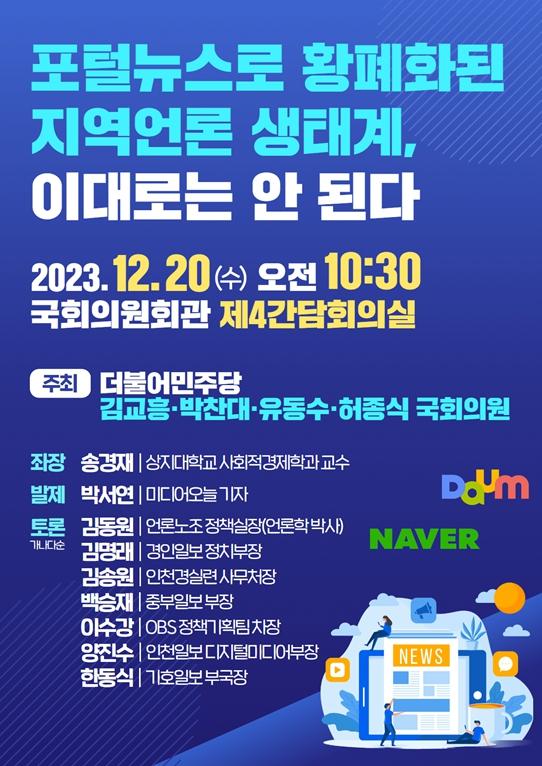 더불어민주당 김교흥(인천 서구갑)·박찬대(인천 연수갑)·유동수(인천 계양갑)·허종식(인천 동구미추홀갑) 국회의원은 오는 20일 오전 10시 30분 국회의원회관 제4간담회의실에서 ‘포털뉴스로 황폐화된 지역언론 생태계, 이대로는 안 된다’라는 주제로 인천지역 언론종사자를 비롯해 언론노조, 시민단체 관계자들이 참여하는 토론회를 개최한다고 밝혔다.