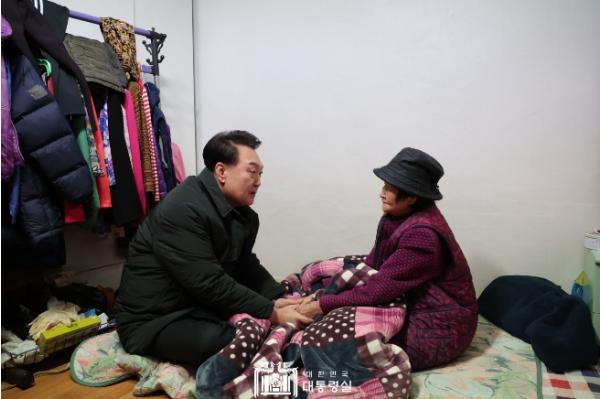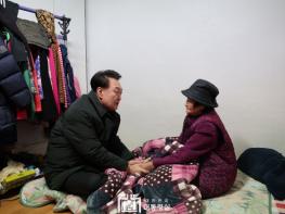 대통령은 추운 겨울 어르신의 안부를 세심히 살피고 집에 난방은 잘되는지, 수도관은 얼지 않았는지, 외풍은 심하지 않은지 등 집 상태를 꼼꼼히 둘러봤다. 또 현장에 동행한 생활지원사의 노고를 격려하며 약자 복지를 위한 정부의 의지를 밝히기도 했다.