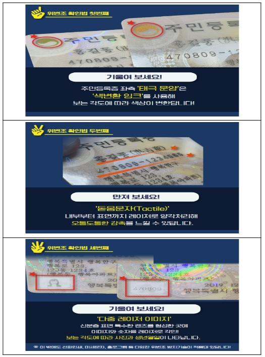 참고로 2020년 1월 1일 이후 발급된 주민등록증은 ▲성명과 주민등록번호 부분이 돋움 처리됐으므로 만져보고 오돌토돌한 촉감이 있는지 여부, ▲좌측 상단의 태극 문양이 빛의 방향에 따라 금색과 녹색으로 색상이 변하는지 여부, ▲좌측 하단의 작은 사진이 보는 각도에 따라 이미지와 숫자(생년월일)가 번갈아 나타나는지 여부를 확인하면 된다.