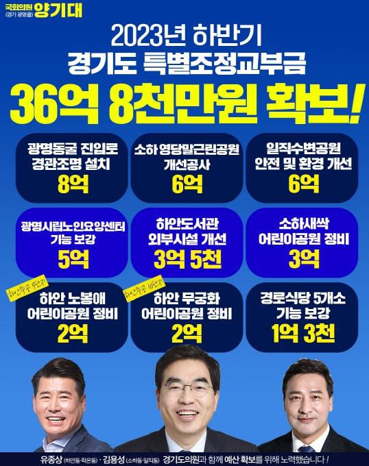 [중앙방송, 박노일기자] 더불어민주당 양기대 국회의원(경기광명을)은 유종상·김용성 도의원과 함께 2023년도 하반기 경기도 특별조정교부금 36억 8,000만 원을 확보했다고 28일 밝혔다.