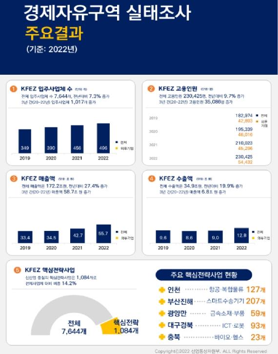 [중앙방송, 박정원기자] 산업통상자원부는 2022년말 기준으로 경제자유구역 입주사업체 실태를 조사한 결과, 입주사업체 수는 7,644개로 전년 대비 7.3%(520개) 증가, 외투기업은 496개로 8.8%(40개) 증가, 전체 고용인원은 230,425명으로 9.7%(20,402명) 증가, 전체 입주사업체의 매출액은 172.2조원으로 27.4%(37.1조원) 증가하여 견고한 성장세를 이어갔다고 '2022년 경제자유구역 입주 사업체 실태조사' 결과를 발표했다.