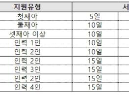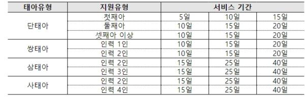 또한, 세쌍둥이 이상 출산가정에 15일, 20일, 25일의 기간 중 수요자가 희망하는 기간을 선택하도록 해 최대 25일까지 이용이 가능했으나 앞으로는 15일, 25일, 40일의 유형으로 운영해 최대 40일까지 서비스를 이용할 수 있도록 확대 지원한다.