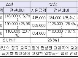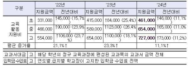 2023년에는 2022년 보다 9천 여명 늘어난 31만 9천여 명의 저소득층 학생들이 교육급여 수급자로 선정됐다. 특히, 올해는 기준 중위소득이 5.47% 인상(4인 가구 기준)되어 더 많은 저소득층 학생에게 교육급여를 지원할 수 있었다. 교육활동지원비 단가 또한 2022년에 비해 평균 23%가 인상되어 연간 초등학생 415,000원, 중학생 589,000원, 고등학생 654,000원을 지원했다.