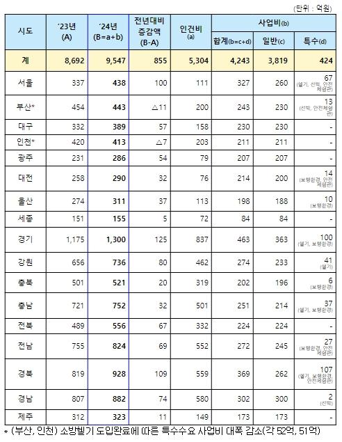 [중앙방송, 박정원기자] 행정안전부는 지자체의 소방 및 안전 시설(장비) 확충 등을 지원하기 위해 2024년도 소방안전교부세*로 전년(8,692억 원) 대비 855억 원 증가(9.8%)한 9,547억 원을 전국 17개 시·도에 교부한다고 밝혔다.