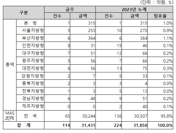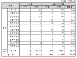 지역별 발주량을 보면, 총액계약 대상 1,187억 원 중 본청이 315억 원으로 26.5%를 집행하고 서울청 등 11개 지방청에서 872억 원을 각각 집행할 예정이다.