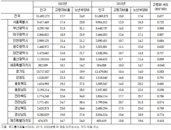분석 결과 고령화 정도는 인구밀도가 낮은 군 단위 지역이 높으며 노인부양비도 전국 평균보다 높은 것으로 나타났다. 전국의 고령화 속도는 0.677로 최근 7년간 65세 이상 고령자가 차지하는 비중이 연평균 0.7%p씩 증가하는 것으로 나타났다. 부산광역시가 0.968로 가장 빠르게 고령화가 이루어지고 있고, 젊은층의 인구 유입이 지속적으로 이루어지는 세종특별자치시는 ?0.040으로 가장 느리게 진행되는 시도로 나타났다.