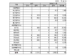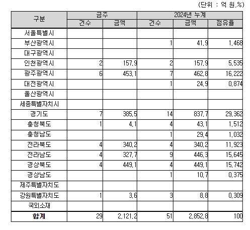 지역별로는 광주광역시 453억 원, 경상북도 449억 원, 경기도 386억 원, 그 밖의 지역이 833억 원이다.