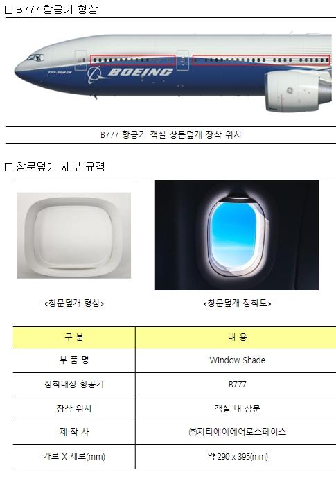 ㈜지티에이에어로스페이스는 자체 개발한 B777* 항공기 객실 창문덮개를 국내 항공사에 1월 중 400개를 납품하고, 올해 총 1,600개를 공급할 예정이다. 이에 따라, 기존에 해외에서 수입하던 부품을 국산품으로 대체하면서 약 130만 달러(16.8억원) 규모의 외화를 절약하고, 항공사는 동일 품질의 저렴한 부품을 공급받게 될 전망이다.