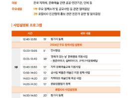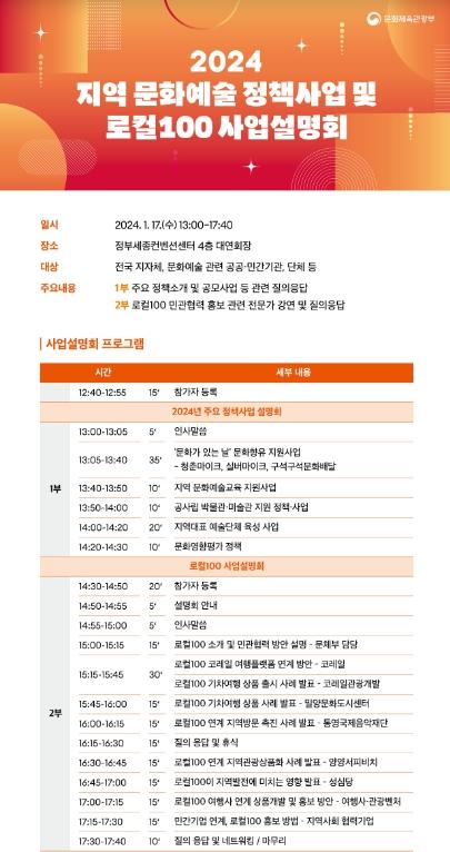 [중앙방송, 김혜영기자] 문화체육관광부는 1월 17일 오후 1시, 정부세종컨벤션센터 대연회장에서 전국 지자체와 민간 문화예술단체·기업 등을 대상으로 2024년에 추진하는 지역문화예술 정책사업과 ‘로컬100’ 사업을 설명하고 홍보 방안 등을 공유한다. 이번 설명회에는 관심이 있는 사람은 누구나 참여할 수 있다.