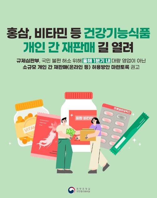 식약처는 식품안전과 유통질서가 보장될 수 있는 범위 내에서 올해 1분기 내 건강기능식품의 소규모 개인간 재판매를 허용하는 합리적 대안을 마련할 것