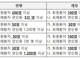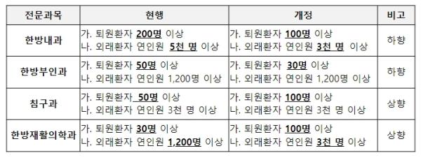 둘째, 한방의료 이용 환자 주요 질환이 내과계에서 근골격계로 변화하는 등의 현실을 반영하여 한방내과 및 한방부인과의 연간 환자 진료실적 기준을 하향하고, 침구과 및 한방재활의학과는 기준을 상향 조정했다.