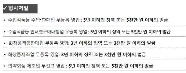 무허가?무등록 관련 주요 위반은 ▲수입식품등 수입?판매업 무등록 영업 42건(10.7%) ▲수입식품등 인터넷구매대행업 무등록 영업 31건(7.9%) ▲화장품책임판매업 무등록 영업 29건(7.4%) ▲의약외품제조업 무신고 영업 7건(1.8%) ▲화장품제조업 무등록 영업 6건(1.5%) 등이었다.