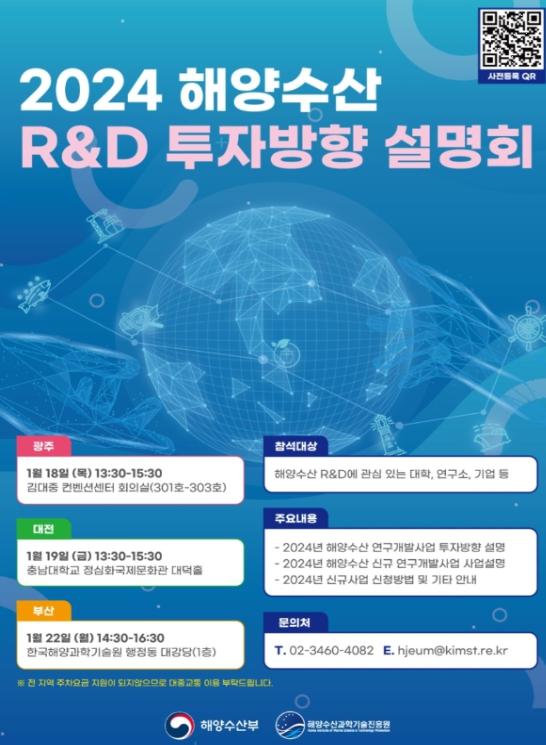 [중앙방송, 박정원기자] 해양수산부는 산·학·연 관계자 등에게 해양수산 연구개발 투자계획을 공유하고, 신규사업에 대한 연구자의 참여를 확대하기 위해 1월 18일부터 22일까지 ‘2024년 해양수산 연구개발(R&D) 투자방향 설명회’를 순차적으로 3차례 개최한다.