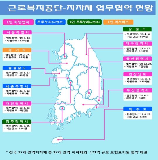 공단은 2018년부터 전국 17개 광역단체 중 13개 광역단체 및 8개 기초단체와 업무협약을 체결해 보험료를 지원함으로써 사회보험 사각지대 해소와 소상공인 보험료 부담완화에 힘쓰고 있다.