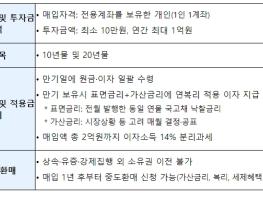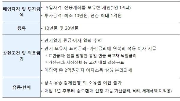 정부는 ’24년에 총 1조원의 개인투자용 국채를 발행할 계획이다. 발행이 개시되면 매월 발표되는 월간 개인투자용 국채 발행계획을 통해 해당 월의 발행액·금리·청약일정 등을 공지할 예정이다. 구입을 희망하는 개인투자자는 판매대행기관에 방문하거나 온라인을 통해 전용계좌를 개설한 후 청약할 수 있다. 10년물·20년물 중 선택하여 최소 10만원부터 연간 1억원까지 구매가 가능하다. 만기까지 보유할 경우 표면금리와 가산금리에 연복리를 적용한 이자가 만기일에 일괄 지급되고, 이자소득 분리과세(14%, 매입액 기준 총 2억원 한도)가 적용된다. 매입 1년 후부터는 중도환매 신청도 가능하다.