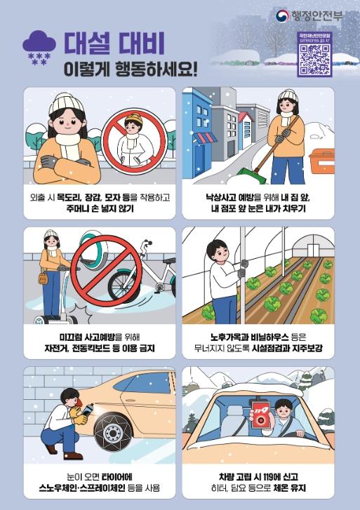 이에 따라, 중앙재난안전대책본부장(이상민 행정안전부 장관)은 대설로 인한 안전사고가 발생하지 않도록 다음 중점 관리사항을 당부했다.