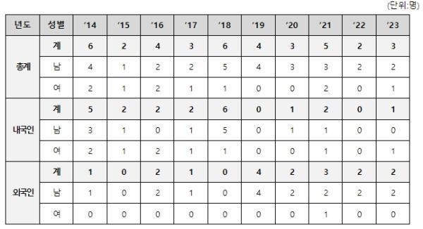 국내에서는 2008년 이후 한 자릿수 신환자 발생이 보고되고 있으며, 2023년도에는 총 3명(내국인 1명, 외국인 2명)의 한센병 신환자가 보고 됐다.