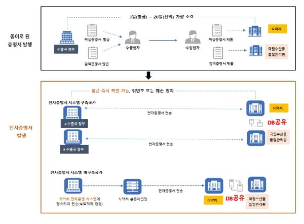 현재 각 기관의 위생?검역 증명서 서식이 다르고 서로 증명서 정보를 공유할 수 있는 체계가 구축되지 않아 수입자는 각 기관이 전자증명서 시스템을 직접 구축한 국가에 한해서만 전자증명서로 제출(이외 종이 증명서 원본 제출) 해야 하는 불편함이 개선되는 것이다.