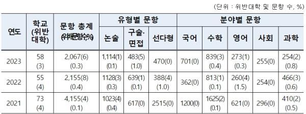 대학별고사 시행 대학의 전체 문항 중 0.3%가, 과목별로는 수학 0.4%, 영어 0.4%, 과학 0.8%가 '공교육정상화법'을 위반했으며, 국어?사회 과목에서는 위반 문항이 없었다.