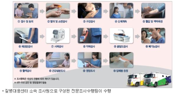 조사는 전문조사수행팀에 의해 매주 4개 지역을 조사항목에 따라 검진, 면접 및 자기기입 방법을 이용하여 검진차량 내에서 실시된다. 대상자의 조사 부담 및 편의를 고려하여 조사 전 인터넷을 통해 자기기입 설문에 참여할 수 있도록 ’23년부터 방법을 개선했다.