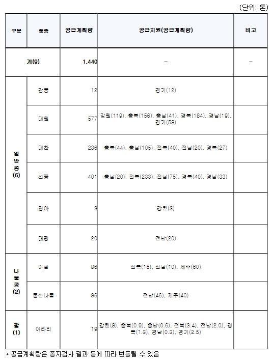 2024년에 공급하는 콩·팥 보급종은 일반(장류)콩 6품종 1,249톤(강풍 12, 대원 577, 대찬 236, 선풍 401, 청아 3, 태광 20), 나물콩 2품종 172톤(아람 86, 풍산나물 86), 팥 아라리 19톤으로 총 1,440톤이다.