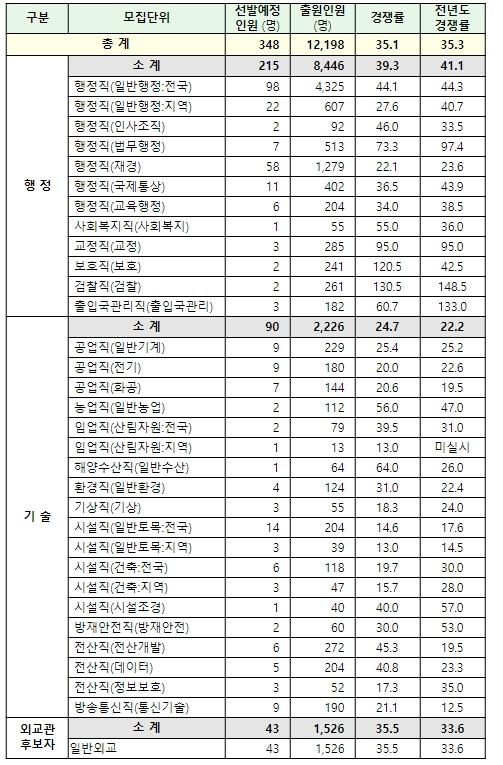 모집직군별 경쟁률은 5급 행정직군 39.3:1, 5급 과학기술직군 24.7:1, 외교관 후보자 35.5:1로 각각 나타났다.