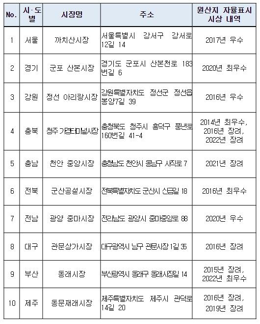 원산지 자율표시 우수 대표시장은 ▲ (서울) 까치산시장, ▲ (경기) 군포 산본시장, ▲ (강원) 정선 아리랑시장, ▲ (충북) 청주 가경터미널시장, ▲ (충남) 천안 중앙시장, ▲ (전북) 군산 공설시장, ▲ (전남) 광양 중마시장, ▲ (대구) 관문상가시장, ▲ (부산) 동래시장, ▲ (제주) 동문재래시장 10개소이다.