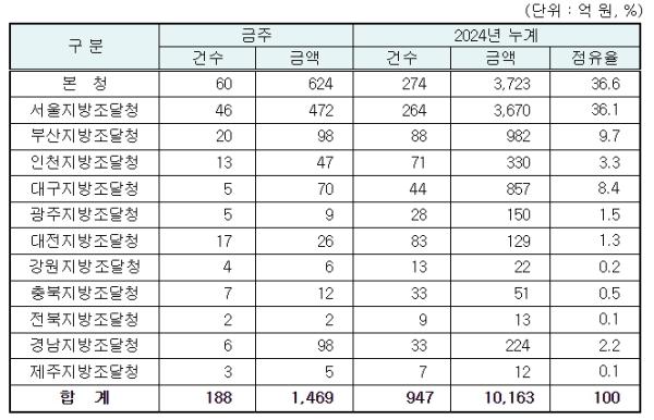 지역별 발주량을 보면 대전광역시 소재 본청 624억 원, 서울지방청 472억 원 등 2개청(1,096억 원)이 전체 금액(1,469억 원)의 74.6%를 차지하고 있으며, 인천 등 나머지 10개 지방청 373억 원이 각각 집행될 예정이다.