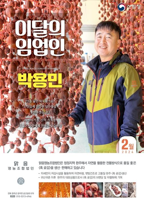 [중앙방송, 손미정기자] 산림청은 2024년 2월 ‘이달의 임업인’으로 전북 완주에서 곶감을 생산하는 박용민(51세, 맑음영농조합법인) 대표를 선정했다고 밝혔다.