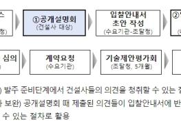 사전설명회 필요성은 지난 1월 23일 대한건설협회와의 간담회에서 주요 대형 기술형입찰 사업의 연이은 유찰 사태에 대한 대책으로 제기됐다. 조달청은 업계 의견을 적극 반영하여 현재 입찰안내서를 준비 중인 ‘정부부산지방합동청사 신축공사’부터 적용하고 2월 중순 동 사업의 사전설명회를 개최할 예정이다.