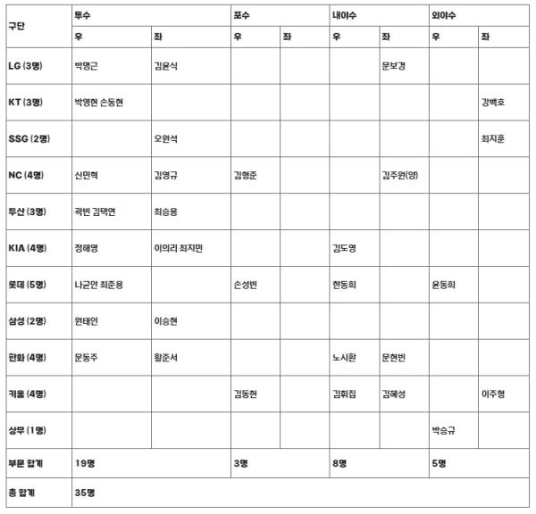 예비 명단 35인은 투수 19명, 포수 3명, 내야수 8명, 외야수 5명으로 구성했으며, 팀 별로는 롯데가 가장 많은 5명, NC, KIA, 한화, 키움 각각 4명, LG, KT, 두산 3명, SSG, 삼성 2명, 상무에서 1명이 대표팀에 이름을 올렸다.