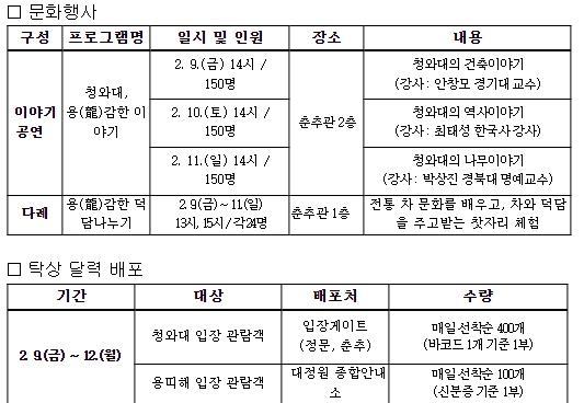 아울러 문체부와 재단은 청와대 대표 공간 사진으로 개방 기념 탁상 달력을 만들어 2월 9일(금)부터 12일(월)까지 청와대 입장문(정문, 춘추)에서 매일 관람객 400명에게 선착순으로 선물한다. 용띠 관람객은 대정원 종합안내소에서 신분증을 제시하면 매일 100명 선착순으로 달력을 받을 수 있다.