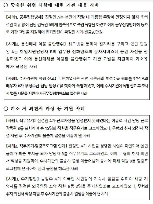 그간 민원인의 악의적인 고발에 대해 직원들이 개별적으로 대응해야 했으나, 작년부터는 기관 차원에서 법률상담, 의견서 작성 등 법률지원을 제공하고 있다. 이를 통해 지난해(8월~12월)에는 피해직원 18명 전원이 불송치 결정을 받았다.