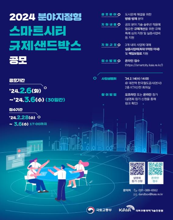 [중앙방송, 박정원기자] 국토교통부는 보다 다양한 스마트도시 기술·서비스의 규제완화를 지원하기 위해 규제샌드박스 활용이 부족한 분야를 발굴하여 규제해소를 지원하는 분야지정형 규제샌드박스 공모를 신설한다.