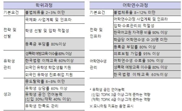 한편, 미인증대학에 대해서는 유학생 유치·관리 실태조사를 실시하여 일정기준을 충족하지 못하면 비자심사 강화대학으로 지정하여 유학생을 유치할 때, 어학 능력, 재정 능력 등 기준을 강화하여 관리한다. 또한 일정 기준을 충족했더라도, 표준입학허가서를 부정 발급한 대학의 경우, 비자 심사 강화대학으로 지정하는 등 유학생 유치·관리 부정 사례를 엄단하기 위해 지속적으로 노력하고 있다.